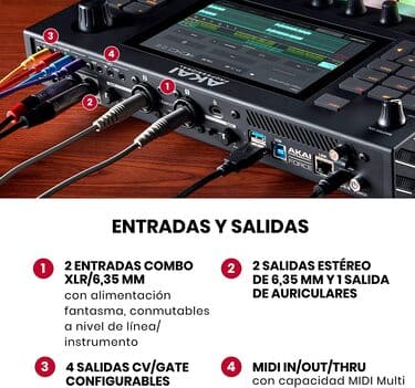 El borde frontal alberga una ranura SD, una salida de auriculares de tamaño completo y mandos para el volumen de los audífonos y de la señal. El panel trasero cuenta con dos entradas de 1/4 de pulgada/XLR con alimentación fantasma e interruptores para los niveles de línea/mic, dos pares de salidas estéreo de 1/4 de pulgada, conexiones MIDI In/Out/Thru en jacks de 3,5 mm y cuatro salidas CV/Gate.