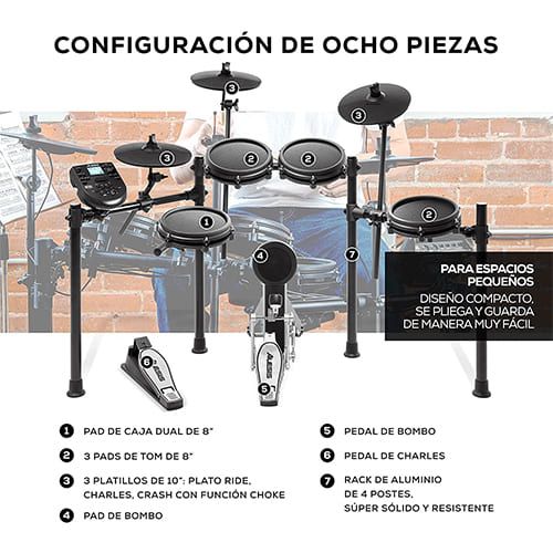- Platos de 10″ (ride, crash con choke, hi-hat)
