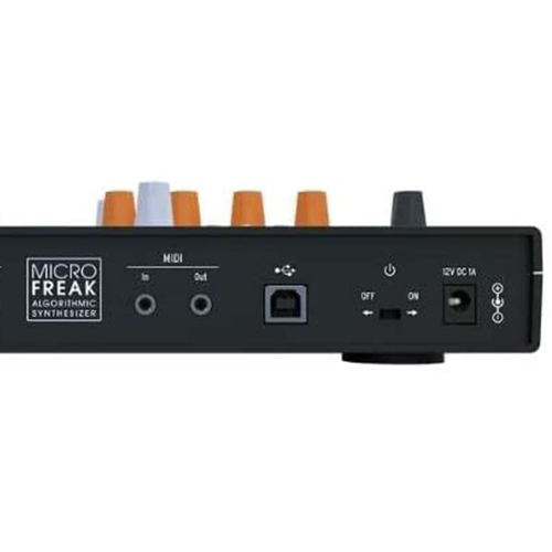 En la parte posterior, el panel trasero de MicroFreak ofrece un montón de opciones de conectividad para un sintetizador tan pequeño. Puede alimentarse por bus a través de USB, o conectarse a la red eléctrica con la fuente de alimentación incluida.