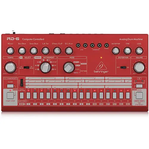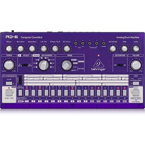 El Behringer RD-6 cuenta con 11 mandos y 26 botones dispuestos de forma muy accesible que devuelven la alegría a la creación de ritmos. Los conectores de entrada y salida del Behringer RD-6 incluyen hi-hat abierto o cerrado, clap, platillos, low y hi tom, snare, y salidas de voz de bombo contienen start/stop para conectar un pedal con MIDI in, out, y thru over USB para conectar el RD-6 a un DAW y puertos MIDI de cinco pines.