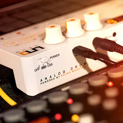 La caja analógica puede sonar un poco débil, pero incluye un elemento de ruido blanco filtrable que amplía la variedad tonal. El Kick 1 es lo más destacado aquí gracias a sus capacidades de modulación de frecuencia añadidas. En su estado básico, es punzante y similar al 909, pero con la adición de FM puede llegar a ser más extraño y con más carácter, capaz de barrer los tonos de percusión de inclinación eléctrica.