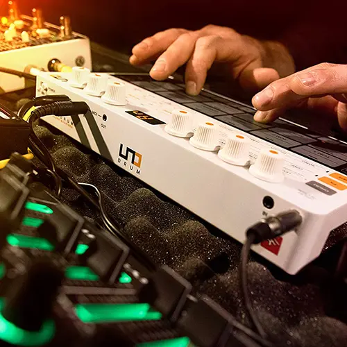 El UNO Drum dispone de una generosa memoria integrada que le permite almacenar 100 kits y 100 patrones. Los kits son selecciones completas de 12 sonidos que incluyen ajustes para el compresor global y los efectos de drive. Los patrones, por su parte, se guardan con toda la automatización.