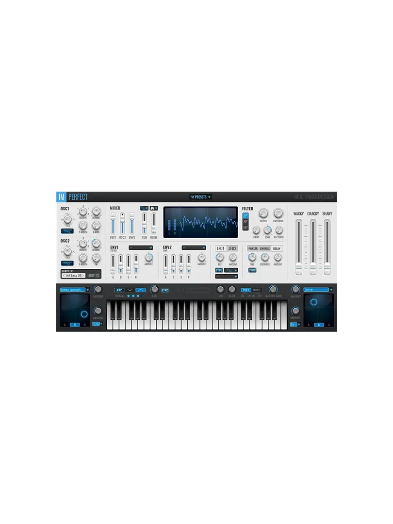 Este sinte presenta 5 potentes osciladores, envolventes, filtros, LFOs y un arpegiador. Donde las cosas empiezan a ponerse interesantes es con los 3 deslizadores especiales de modulación. Llamados «Wacky», «Cracky» y «Shaky», estas funciones introducen efectos modulados, armónicos saturados e inconsistencias de afinación.