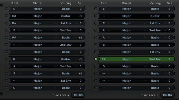 Instachord incluye casi todos los acordes comunes (maj, min, sus2, 6ª, 7ª, etc) en 5 voicing diferentes (básico, 1ª y 2ª inversiones, guitarra y amplio). Cada modo de voicing tiene un sonido único debido al orden de las notas y puede ser una mejor opción para encajar con los otros acordes de la canción.