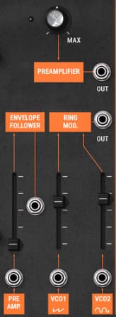 El modulador en anillo es un módulo que multiplica dos señales (generalmente dos osciladores) para generar componentes frecuenciales no armónicos. De este modo, puedes obtener fácilmente sonidos más metálicos.