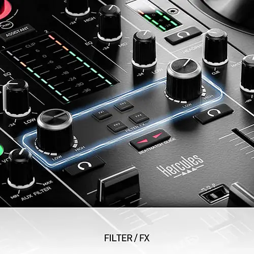 - Controles de filtro: el controlador Hercules Inpulse 500 incorpora un ncualizador de 3 bandas, controles de ganancia, controles de volumen y medidores de VU por plataforma