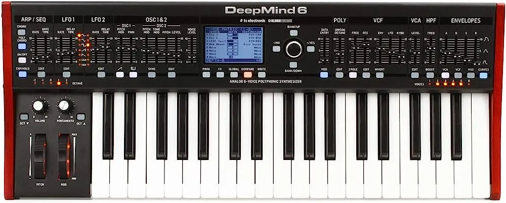 - DEEPMIND 6: Cuenta con una polifonía de 6 voces, lo que significa que puedes tocar hasta 6 notas simultáneamente. Esto es ideal para crear arreglos y acordes complejos.